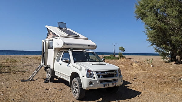 Près de Skala : une belle plage, du sable, une douche, quelques campeurs.... encore un bivouac idéal
