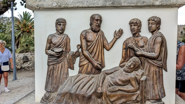 Bas relief (récent) montrant Hippocrate et ses élèves